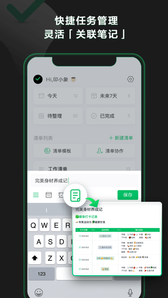 -印象笔记特有功能,你可以在清单内关联笔记,将清单内的任务与相关笔记资料建立关联,让备忘更强大,任务描述更清晰