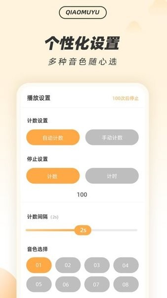 1.自定义设置钟爱的被敲击后的木鱼声。在敲击木鱼过程中会自动计数