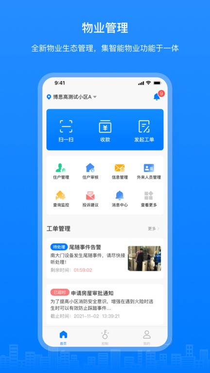 博享家物业版软件适合物业的工作人员来使用,能够便捷的在手机上查看每天的待办工单,可以进行住户的审核和管理,能够用手机开各个门禁,支持设置门禁的密码和进行人脸录入,能够在线查看实时以及以往的监控视频录像。