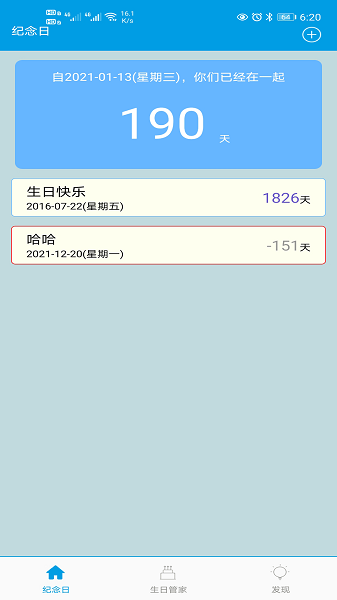 2、实用的纪念日功能,可用于查看情侣在一起的天数,添加和记录下各种重要的日子,查看已经过去多少天或倒计时多少天,为每一个重要的日子打下标签;