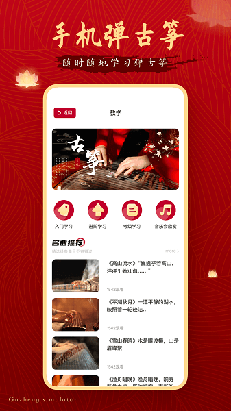 专为古筝设计,将古筝演奏符号和弦位结合起来,形成实时的演奏提示,零基础也能轻松弹奏专业古筝曲。