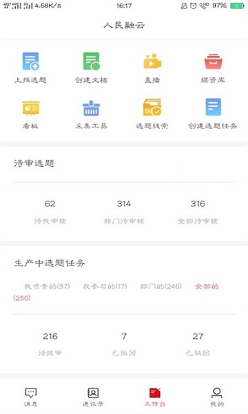 人民融媒是移动端智能内容生产平台,集“策、采、编、发”整个内容生产流程为一体,涵盖实时通讯、线索汇聚、选题策划、文稿制作、移动审核、内容素材统一管理、移动直播、生产工具等功能,与Web端全程协同,多端协作,为内容工作人员提供一种更加高效实用的移动采编平台。