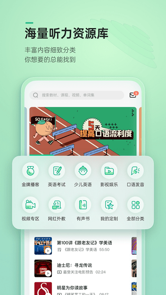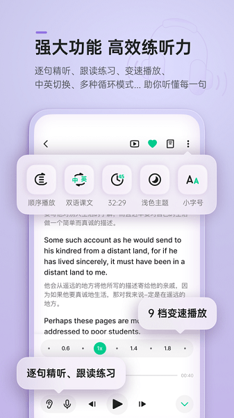 四六级考研、雅思托福、BEC、口笔译……国内外考试的听力真题和备考资料,配合全方位精听泛听功能,听力提升更高效;