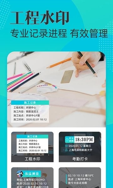 时间地点打卡(可修改自定义)、工作拍照、团队考勤打卡、建筑施工工程管理、物业管理、外勤拍照、旅行拍照、宝宝成长拍照