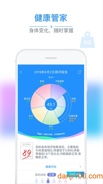 连接智能健康秤,全面检测19项身体数据(身体年龄、体脂、肌肉、BMI等等),自动生成身体数据报表,日报、周报详细比较,身体变化轻松掌握。