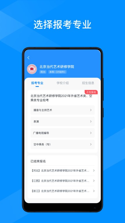 【艺考报名】院校发布招生信息,考生选择专业进行报名。