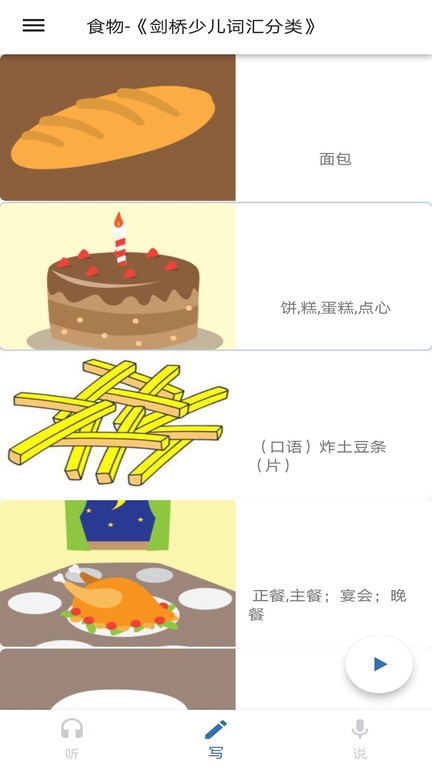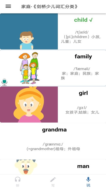 我说你写app软件主要锻炼用户单词听写方面的能力,这里的单词会有形象的配图,标准发音以及解释,能够在线记单词学口语,可以进行单词听写测试,看看自己的记单词效果,可以制作属于自己的词单。