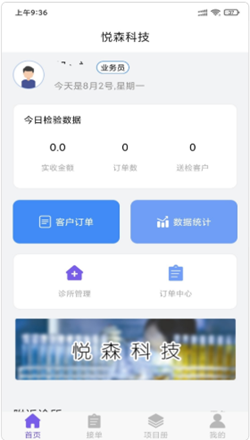 3.可以实时看到今天的检测数据,实收金额、订单数、送检客户等等都非常的清楚,还有数据统计,清楚的知道订单的总体情况。