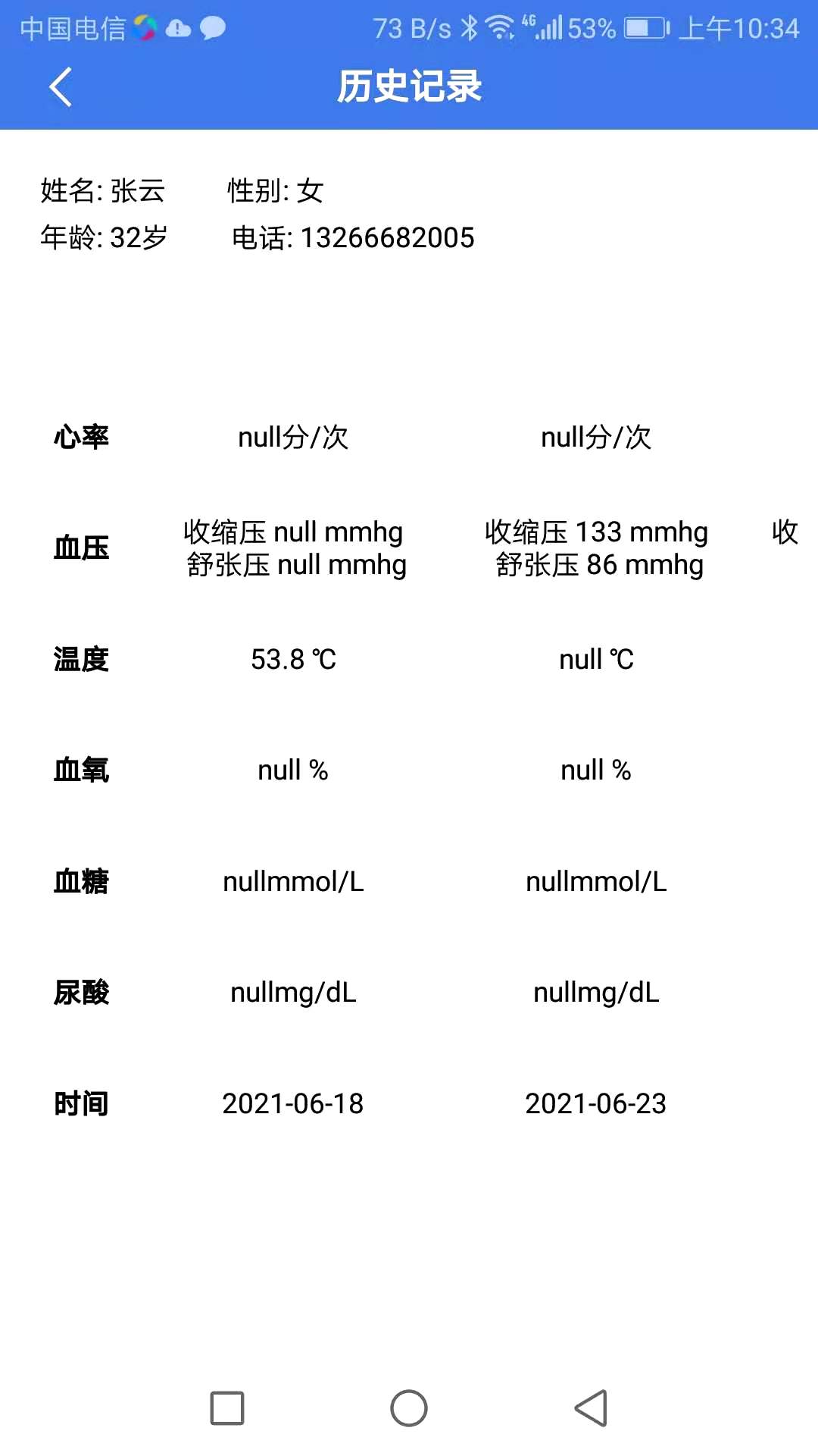 3、个人用户登录的时候,可以在这里登记自己的个人数据,及时了解自己的血压,血氧,尿酸的数据,同时也可以查看历史记录,了解身体变化;