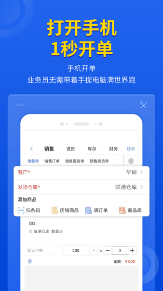 - 包含销售、进货、库存、财务常用单据,让您外出办公无需繁琐操作,打开手机即可快速开单