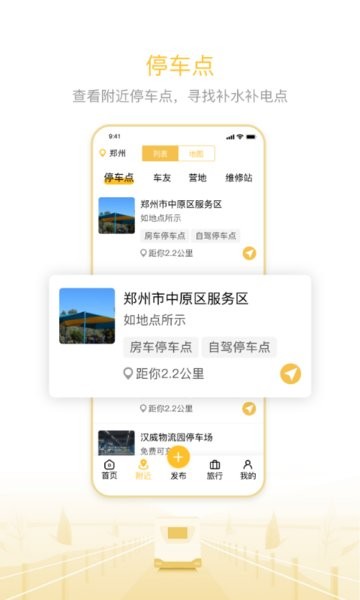 【停车点】用户自主分享停车点,方便车友根据定位快速寻找附近停车点,及时补水补电