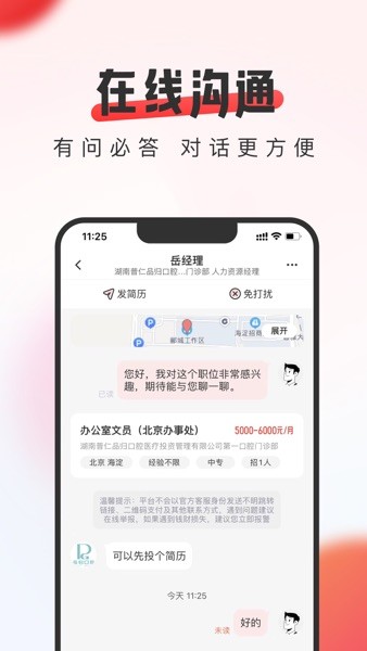 求职者和企业可以通过微聊随时随地进行沟通,移动设备连接更高效