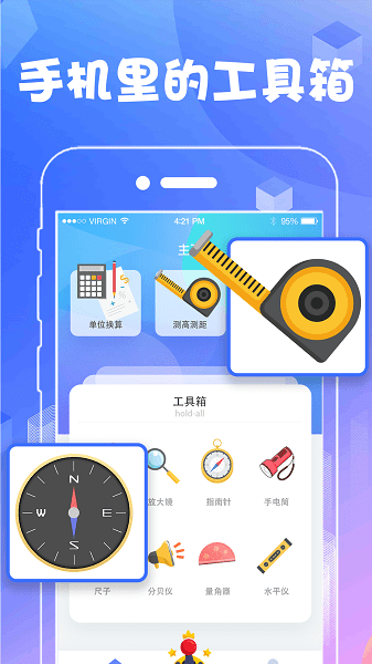 【测量工具箱】长度测量、量角器、水平测量仪集多款测量测距工具于一体,解决小日常的问题。还可进行长度、体积、面积、重量的单位换算,不但日常生活及工作中所需,有时辅导孩子学习作业还能派上用场。
