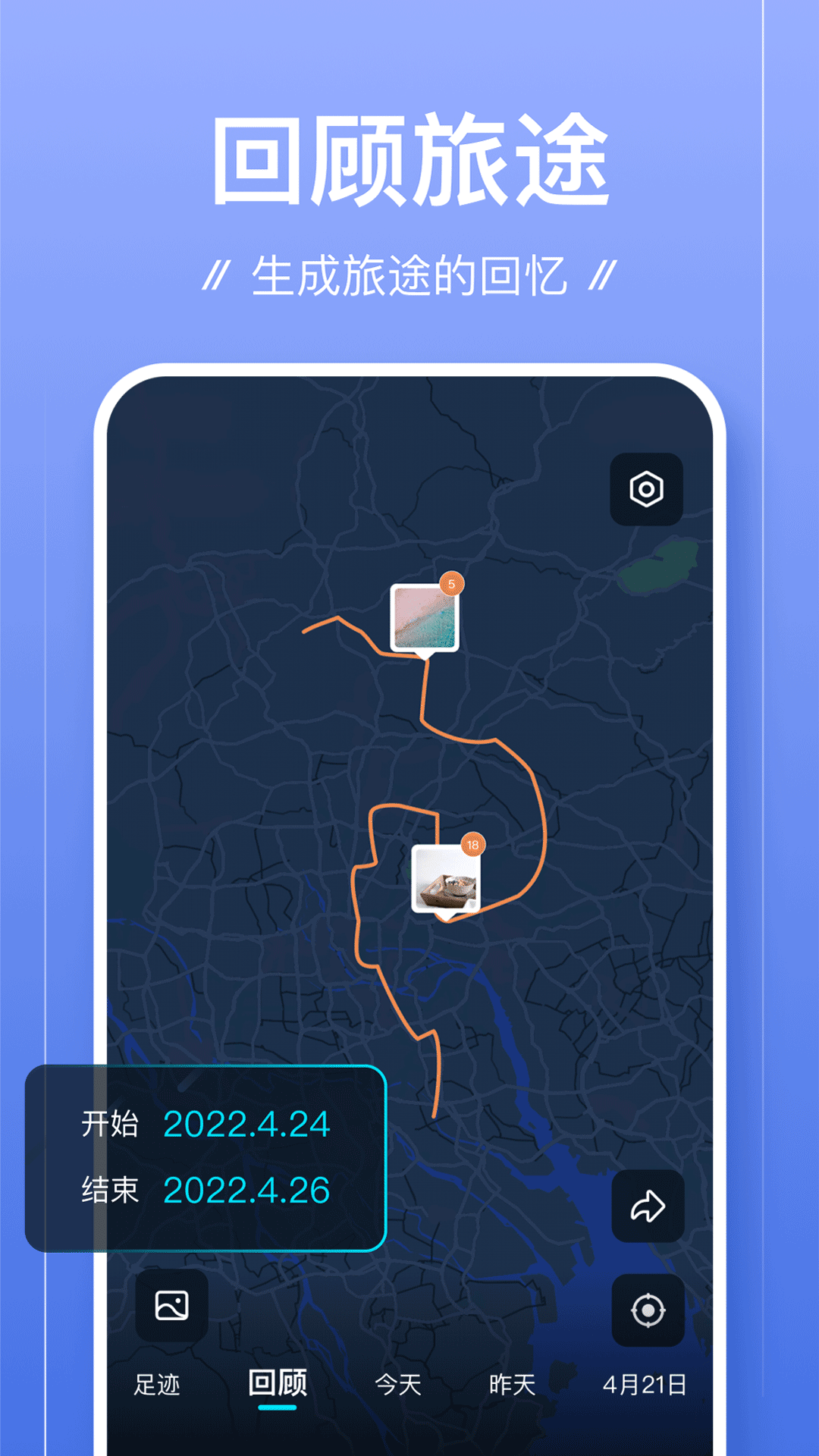 足迹app安卓下载,一款高效便捷的记录轨迹生成地图的实用工具,通过足迹app实时记录每一步,标记每个城市地点,分享旅行轨迹,共享亲友位置等,更多功能请下载了解。