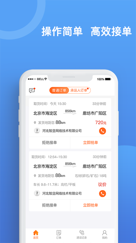 可显示通话记录,订单中出现的任何状况,可以通过界面上的电话进行及时沟通,方便第一时间处理问题,司机和承运人个人信息也能够得到轻松管理,