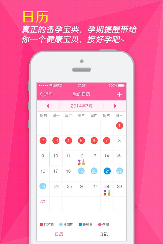 [日历]您的月经期,安全期,排卵期,体温,心情等都会呈现在日历中,让您了解自己每天的情况!