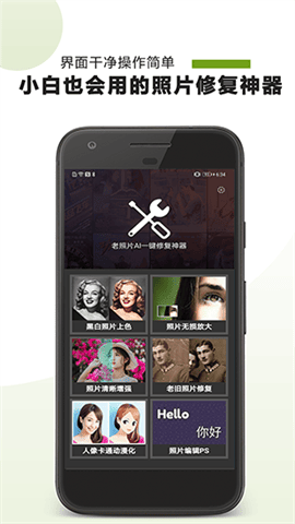 包括照片破损修复、黑白照片上色、无损放大、模糊照片清晰增强等实用工具。