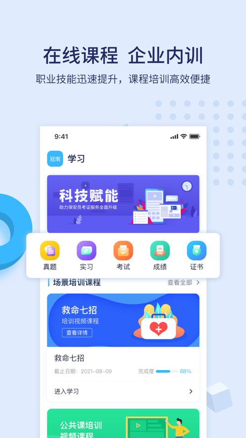 1、在线培训:在线高品质专业培训课程,保安员资格证、等级考试报名、培训、考试整体解决方案,量身打造企业专属学习平台,提升员工能力;