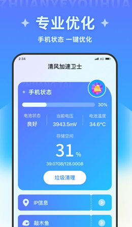 清风加速卫士app,是一款提供手机加速、清理垃圾、电量管理、网络优化等多种功能的清理优化软件。在线就能帮助用户快速清理手机内存,释放手机空间,提升手机运行速度,还可以管理手机电量,延长手机电池寿命,同时还可以优化网络,提高网络连接速度和稳定性。提供一键加速、智能清理、软件管理等实用功能,方便用户管理手机应用和系统。