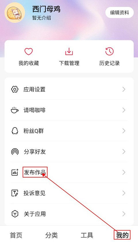 1、用户点击右下角“我的”,进入个人中心,点击中间的“发布作品”即可进入。