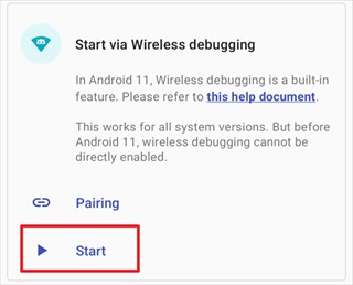 通过无线调试启动适用于 Android 11 或以上版本。这种启动方式无需连接电脑。由于系统限制,每次重新启动后都需要再次进行启动步骤。