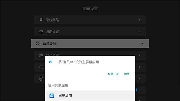 6、之后使用遥控器,点击上面的home键(当贝遥控器上是一个小房子图标),出现[将当贝OS设为主屏幕应用],选择下方的【当贝桌面】,在选择【始终】;