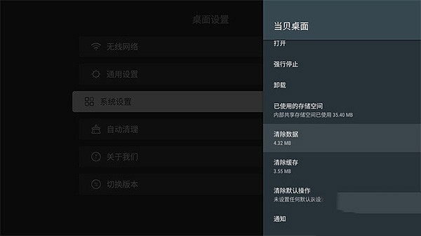 5、点击【当贝OS】,找到并依次点击【清除数据】—【清楚缓存】—【清楚默认操作】选项;