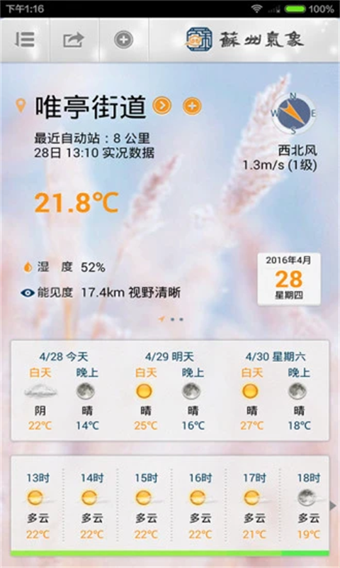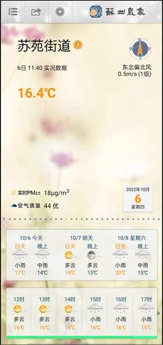 1、精细化预报,苏州范围内12小时逐时天气预报,精准到位。