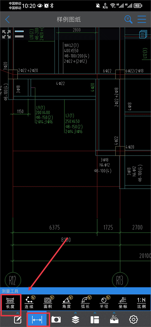 2、进入后将图纸放大,并在下方功能中的测量工具内点击长度