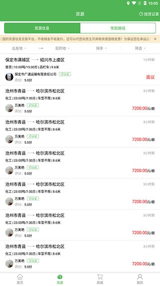 2、如果想查看更多货源信息,可以到【货源】页面进行浏览,点击具体货源后可以联系货主来提交报价。