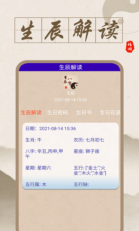 福娃生辰八字app是一款非常优质的生辰八字测测算软件。广大用户可以在平台上搜索到自己的生辰八字,平台为广大用户提供最优质的生辰八字测算服务,用户可以在平台上放心测算。平台不仅为广大用户提供非常全面的生辰八字测算功能,同时为用户提供非常全面的占卜业务服务,用户们可以在这里了解到各种各样的传统占卜消息,还可以进行生辰八字的解读,生日书等服务。感兴趣的用户赶紧下载软件试试吧!