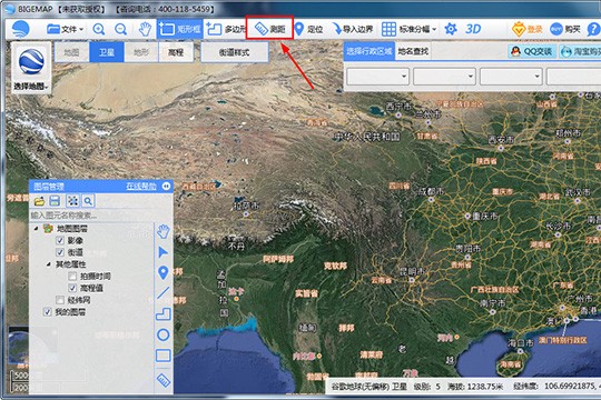 1、首先需要先进入到BIGEMAP的软件中,大家可以在这里看到不同国家与地区的地图、卫星图以及高程图,用户可以根据的需要在左上方进行选择,选择合适的浏览方式后,先来说说怎么测量距离,在上方的功能栏目中点击“测距”功能开始地图距离的测量,如下图所示: