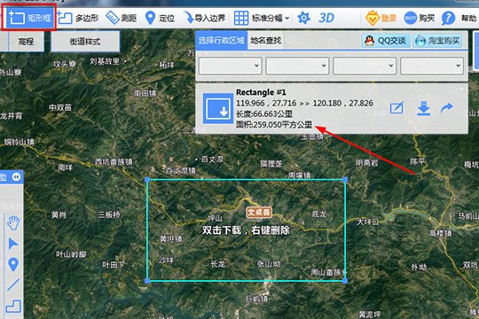 3、说完了两个点之间的距离,下面来说说怎么测量面积,点击左上角的“矩形框”即可测量选框内的面积,在点击后将会在右上角出现总长度以及面积数值信息,如下图所示: