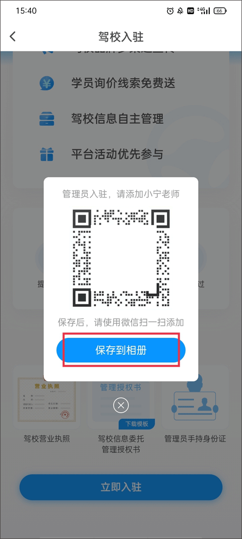 3、将这个二维码保存到手机上并用微信扫描添加管理员进行入驻,入驻成功后就可以开始招收学员了。