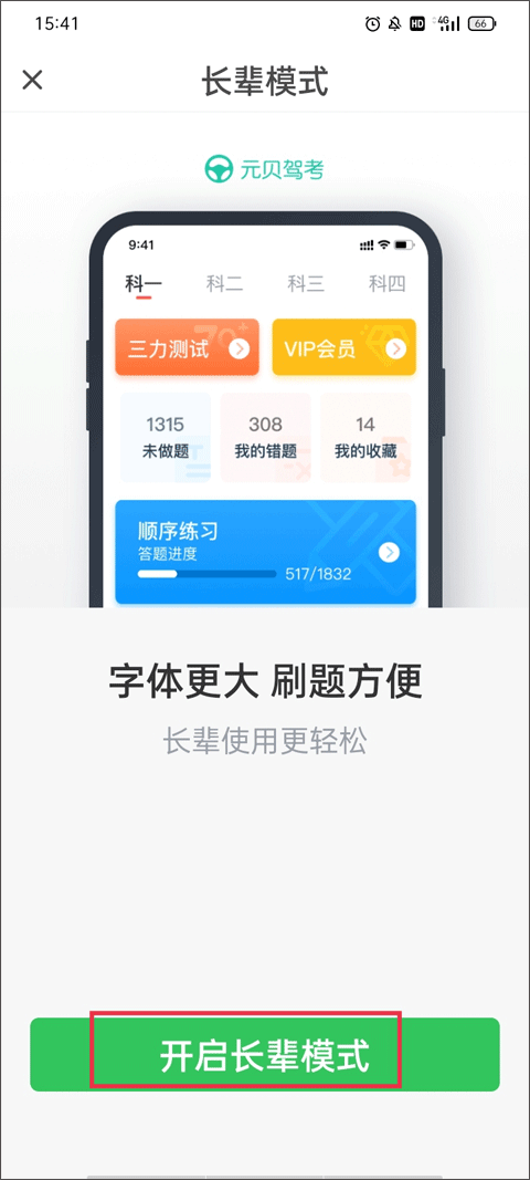 2、字体更大,刷题方便,长辈使用可以更加轻松,点击下方的“开启长辈模式”。