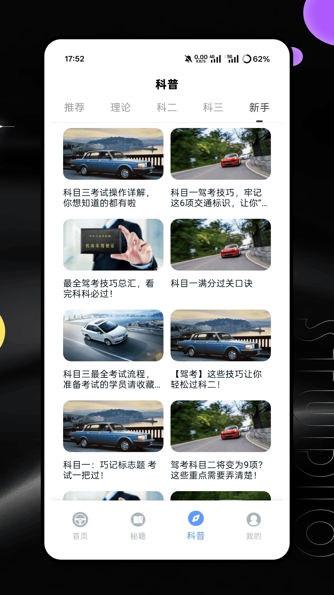 驾照模拟考试是一款非常不错的驾照学习软件,为用户提供了专业的停车场场景模拟,通过手机端看到地库停车的场景模拟,让你在不同的环境下可以进行训练,还有各种教程视频在这里都可以找到,随时可以进行线上学习方便快捷,感兴趣的快来下载软件试试吧。