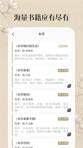 1.为用户提供了海量的中医经典书籍和养生必读书籍。