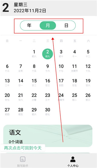 1、打开软件进入主页面,点击这里这里设置年月日,记录孩子每一天的默写情况