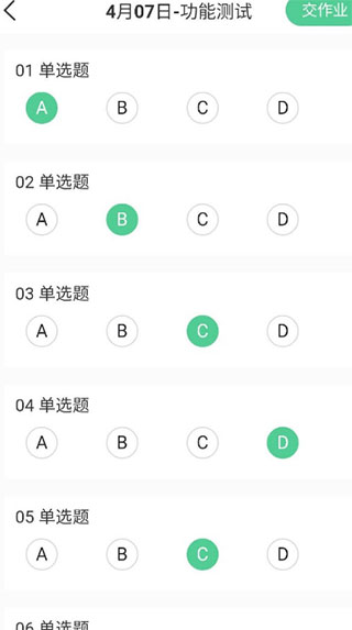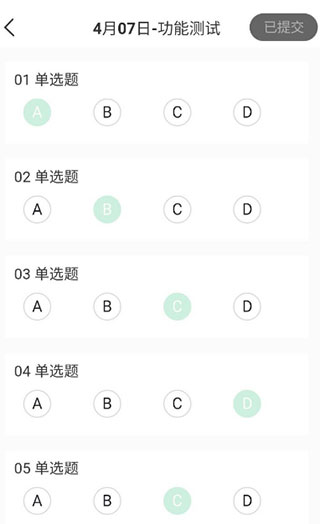 我们在这可以看到,提交后的界面,选项已变色无法进行修改。如果主观题没有提交图片。在教室阅卷时会提示该生未作答。