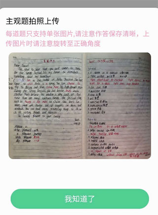 点击进入答题卡,系统会有一个提示“主观题拍照上传”的要求,点击知道了即可正式开始答题。