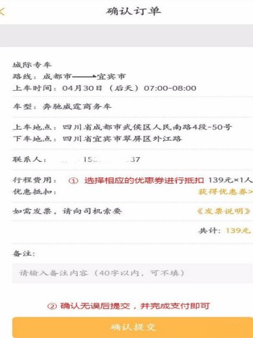 提交订单后,在确认有无错误,可选择优惠券抵扣,并完成支付。目前易来客运app官网最新版支持支付宝和微信付款。