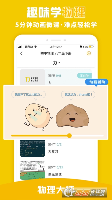 2.大片式课程,精美的动画视频,动听的音效音乐,内容生动有趣,更好理解。课本知识结合日常生活,娓娓道来,知识点不再抽象!
