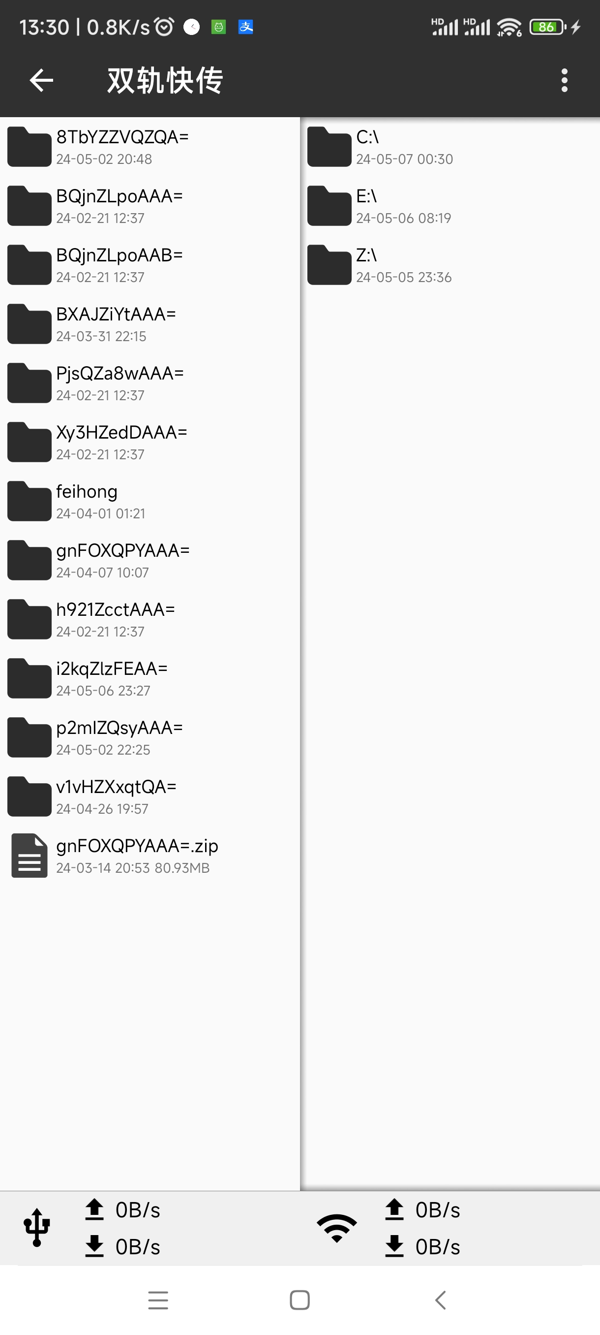 UI是双排文件管理器(照搬的MT管理器)。左边文件列表是当前手机的文件列表,右边为电脑的文件列表。