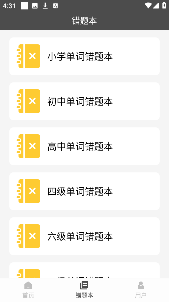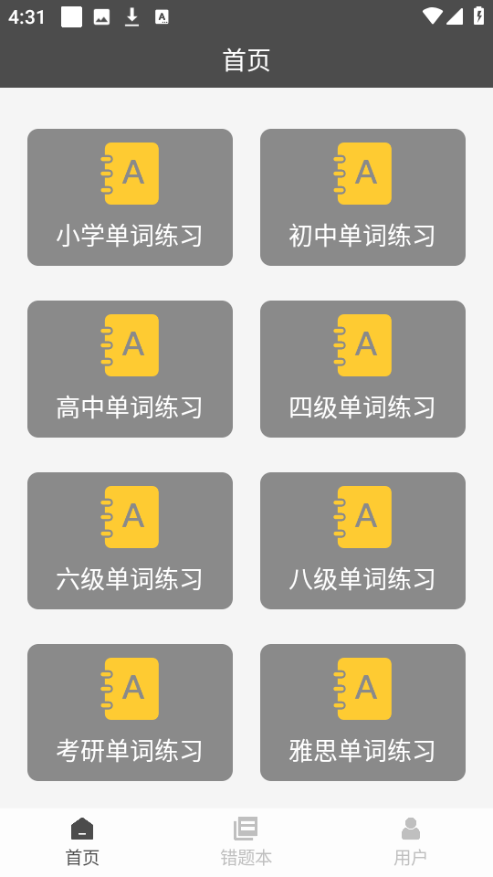 2、成功进入首页之后,我们可以看到四级单词练习,六级单词练习等多种功能模式。