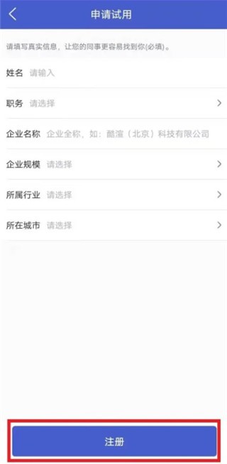 3、提交企业名称,行业分类和所属城市等信息,申请试用。
