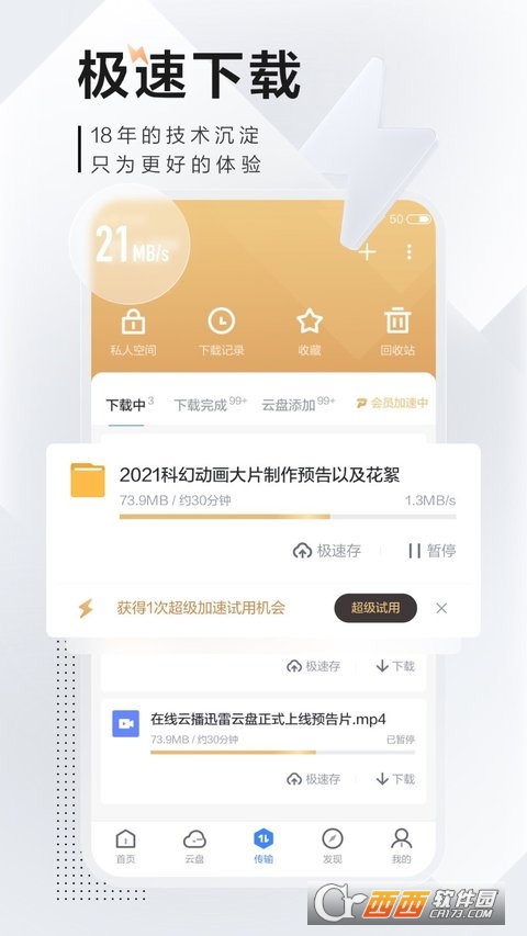 一键加速,开启高速下载体验;无需会员,免费在线云播体验; 看电影、追美剧、搜妹子…全网资源订阅;精选推荐、快捷搜索、频道订阅,总有一种方式让你心动; 迅雷独享,不耗流量,资源互传比蓝牙快!手机迅雷,不仅仅是下载!