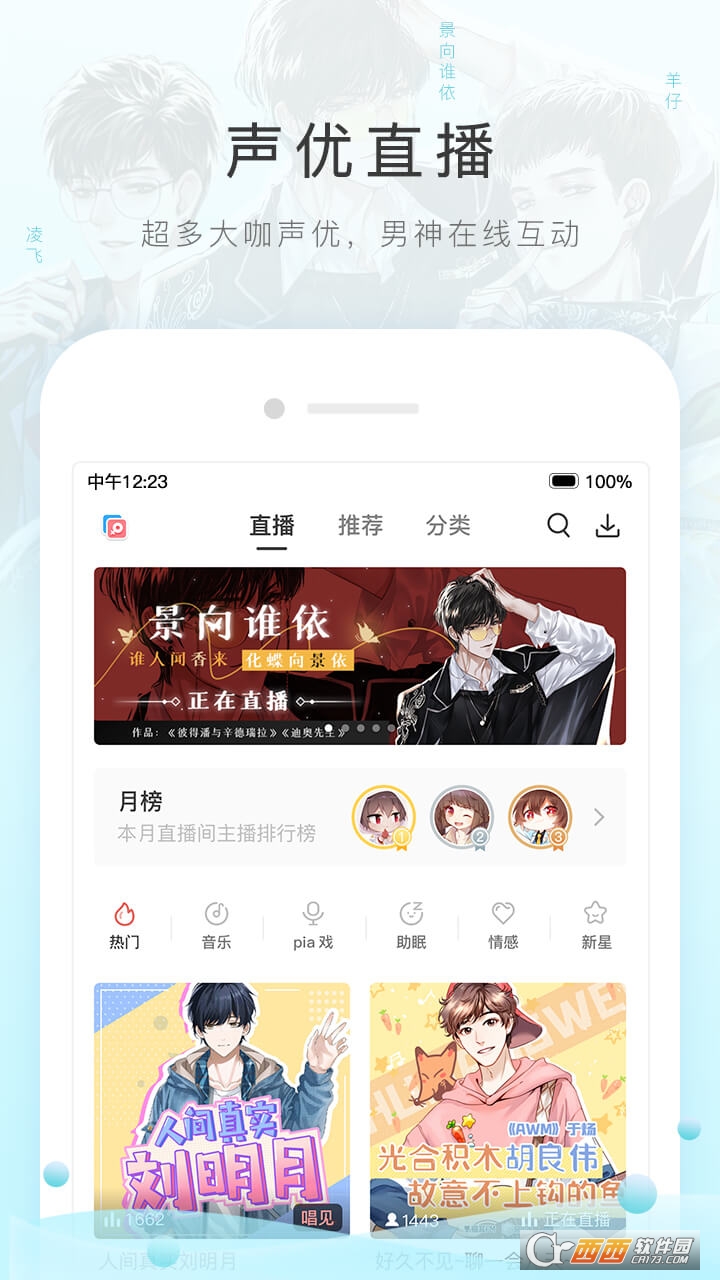 汇集中日知名 CV、二次元、段子手、催眠等不同领域的大咖主播;开启语音连麦,和大咖互动,用声音交友;做主播,被搭讪被打赏,从此生活奔小康!