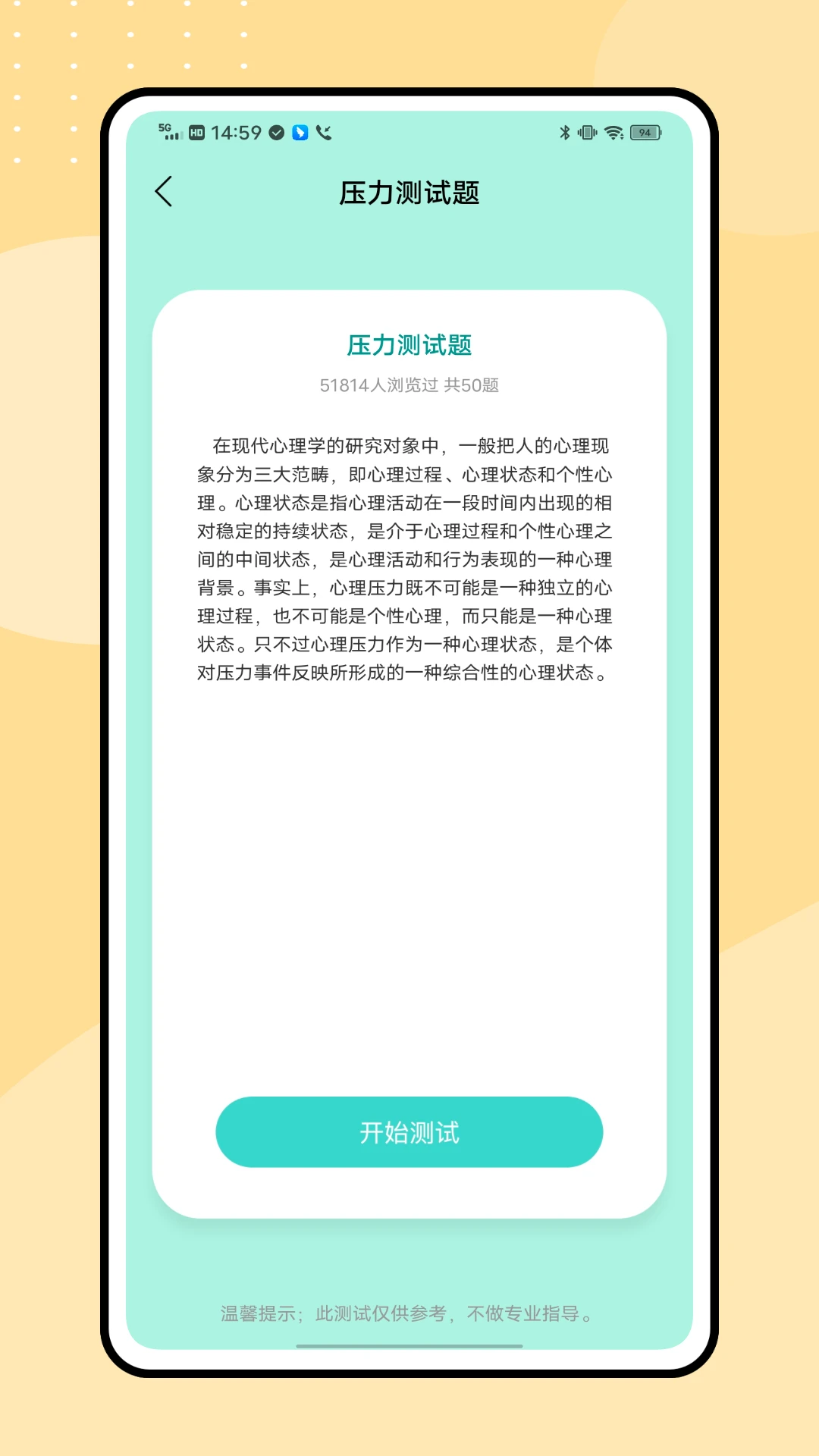 3、压力测试 通过压力测试题,从心理学研究出发,运用量表记录以及问卷调查针对社交、情绪、乐观、恐惧等记录。