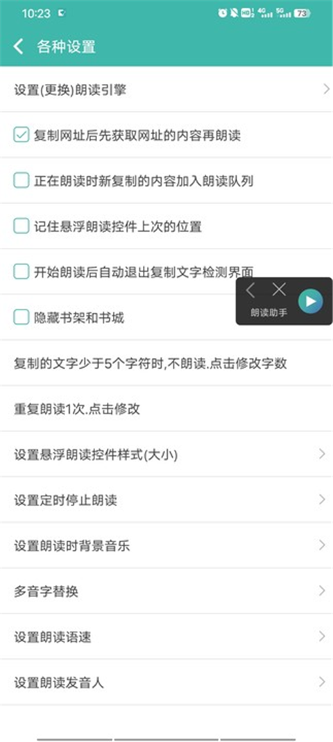 8、你可以在软件首页的设置里可以设置各种参数,如重复朗读次数、朗读背景音乐、加入朗读队列等。