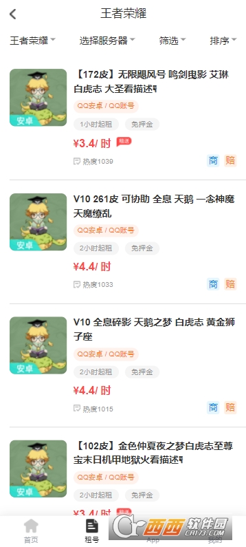 3.选择账号、租用自己心仪的账号.选择游戏,区服,输入段位搜索,或者输入其他想租的信息搜索